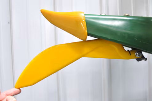 The patented corn sensor skid shape brings the point of contact to the ground closer to the tip as the snout gets closer to the ground. It feels the bumps earlier and have the HHC react early enough to avoid collision. The corn sensor is at the very tip of the snout, further forward than the original sensors.